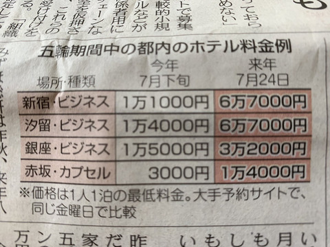 【画像】オリンピック期間中の都内のホテル料金wwwwwwwwwww X Facebook はてブ LINE コピー 2019.07.27 スポンサーリンク 1:名無し募集中。。。:2019/07/24(水) 19:43:46.36 ID:0.net ヤバすぎw 2:名無し募集中。。。:2019/07/24(水) 19:44:45.88 ID:0.net カプセルで14000円てマジか 4:名無し募集中。。。:2019/07/24(水) 19:45:28.78 ID:0.net マジかよ 5:名無し募集中。。。:2019/07/24(水) 19:45:41.35 ID:0.net 俺の空き部屋10000円でどうや 続きを読む