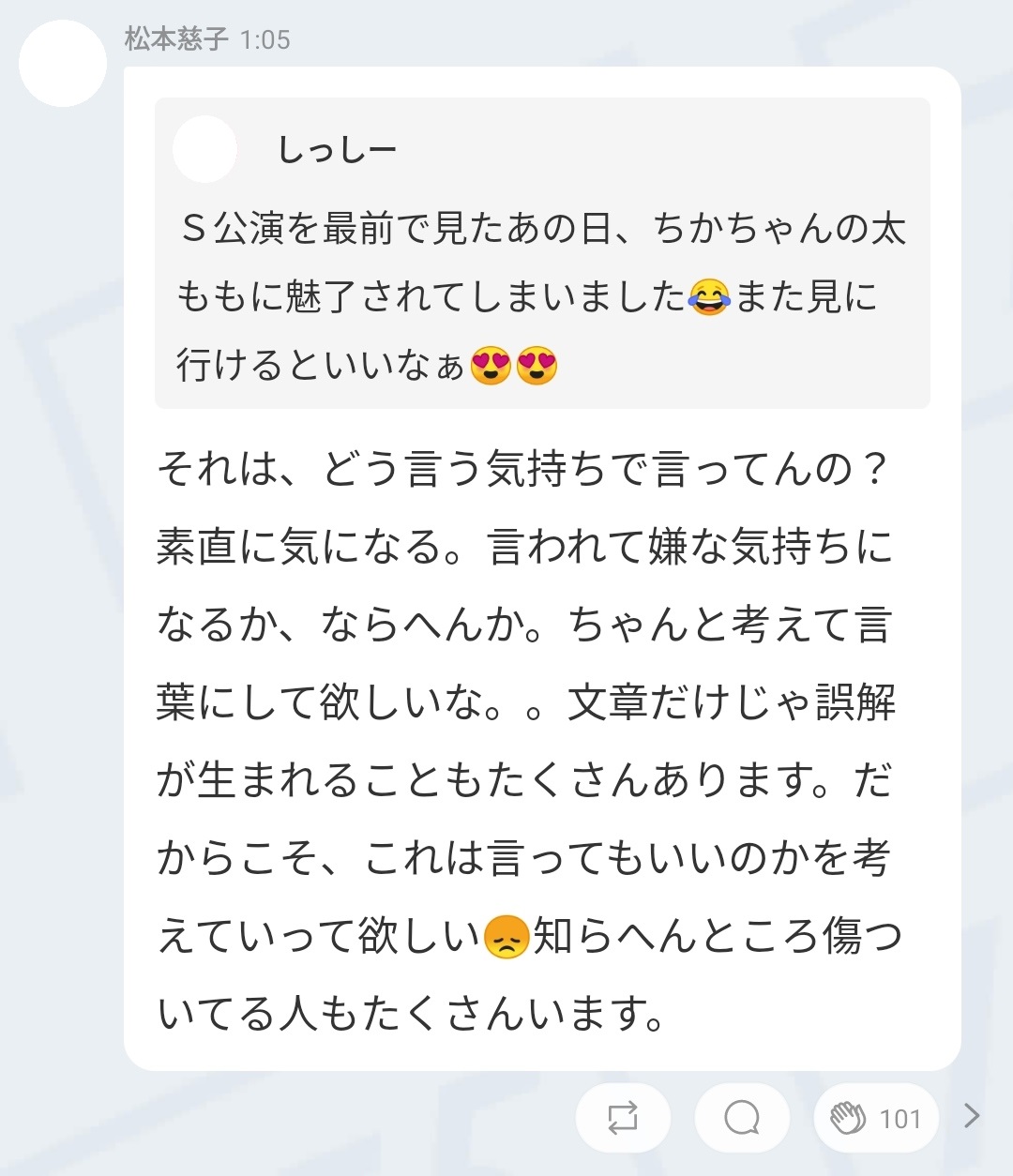 AKBオタ「ライブで太ももに魅了されました😍」→メンバーブチ切れで公開説教wwwwwwwww X Facebook はてブ LINE コピー 2020.07.02 スポンサーリンク 1:風吹けば名無し:2020/07/02(Thu) 16:30:30 4:風吹けば名無し:2020/07/02(Thu) 16:31:18 正論だな 6:風吹けば名無し:2020/07/02(Thu) 16:31:30 こいつら娼婦だっていう自覚ないんか? 12:風吹けば名無し:2020/07/02(Thu) 16:31:59 >>6 オタクの娼婦じゃないんやけど 誇大妄想して被害者面すんのきもいで 続きを読む