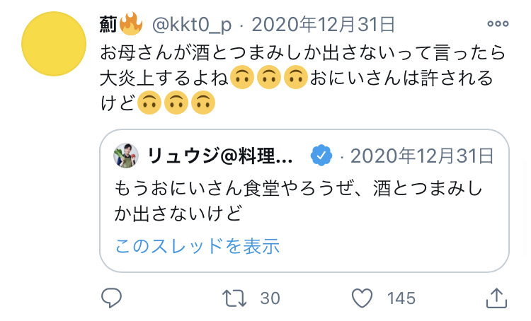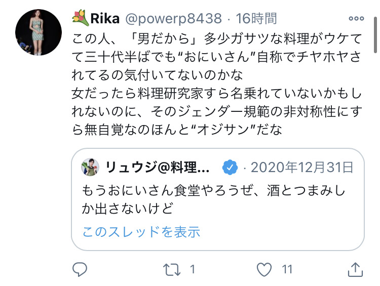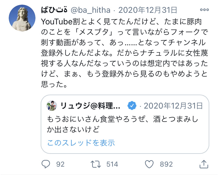 料理YouTuberリュウジ「お母さん食堂がダメ?じゃあお兄さん食堂やるわ」→大炎上wwywwywwyw X Facebook はてブ LINE コピー 2021.01.02 スポンサーリンク 1:風吹けば名無し:2021/01/02(土) 18:07:06.94 ID:DhEKyp7Ud.net ↓ フェミさんブチギレ 3:風吹けば名無し:2021/01/02(土) 18:07:26.23 ID:DhEKyp7Ud.net ええんかお前ら… 5:風吹けば名無し:2021/01/02(土) 18:07:48.14 ID:DhEKyp7Ud.net リュウジレシピ大好きだから潰されないでほしい 6:風吹けば名無し:2021/01/02(土) 18:07:59.15 ID:BADRlL/G0.net こいつならいくら叩かれてもええわ 続きを読む
