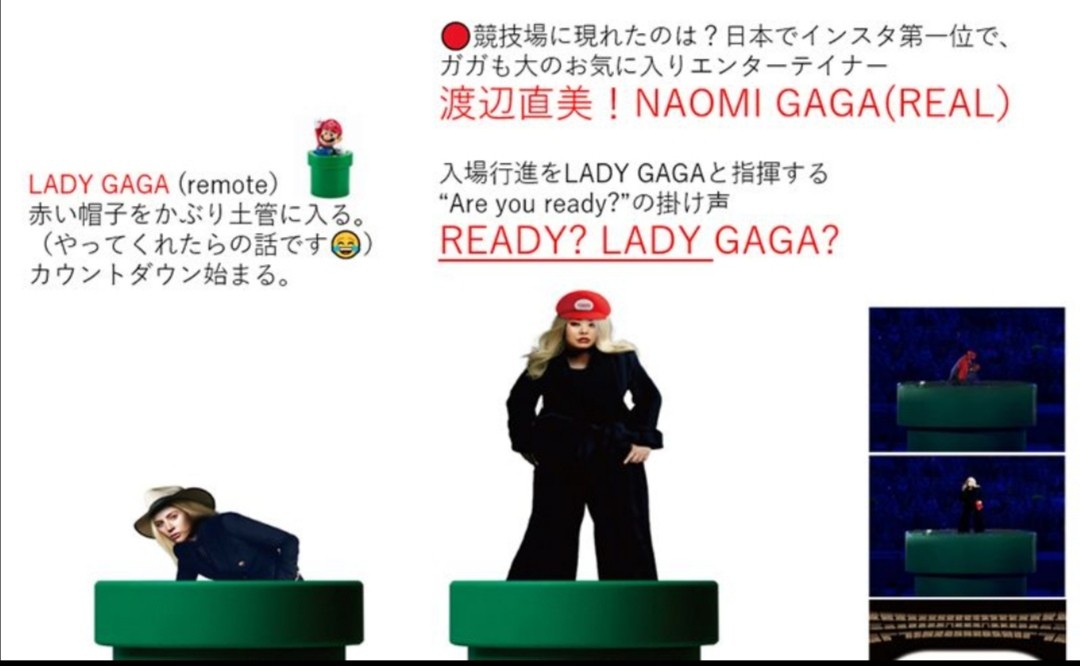 >さらにレディー・ガガが赤い帽子をかぶってマリオの土管に入ると、同じ格好の渡辺直美に入れ替わるというサプライズ演出も描かれていた。ただ、佐々木氏の思い付きに留まっているのか、レディー・ガガの箇所には〈やってくれたらの話です〉と断り書きが記されていた。他方で、任天堂が監修していた競技紹介はこの頃から、ピクトグラム隊による〈コメディパフォーマンス〉に変わっている。