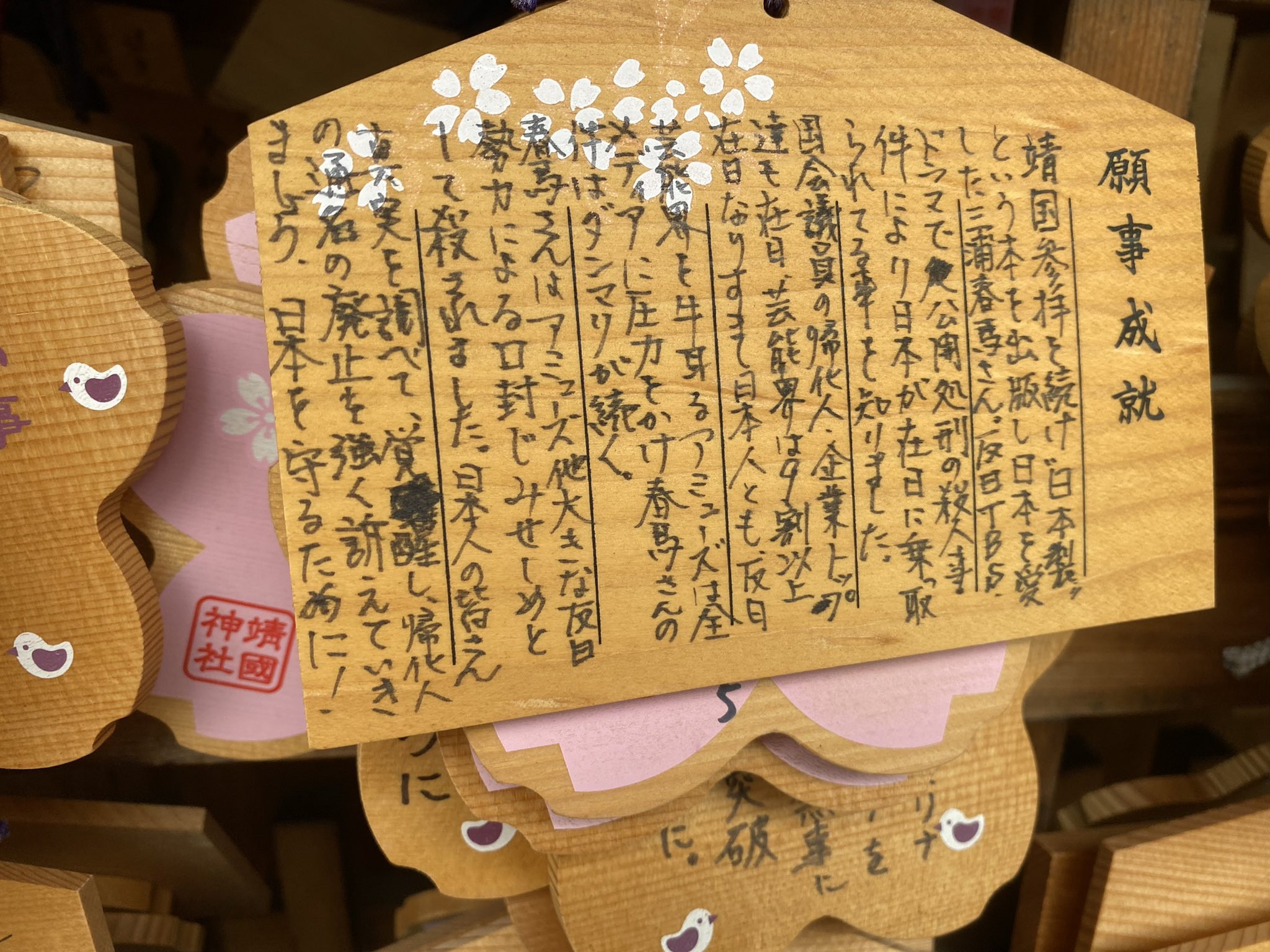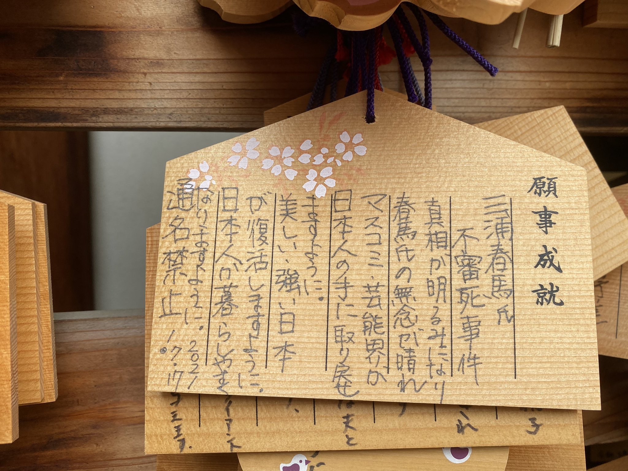 【画像】靖国神社の絵馬、三浦春馬自殺の陰謀論ばかり… X Facebook はてブ LINE コピー 2021.08.15 スポンサーリンク 1:風吹けば名無し:2021/08/15(日) 14:29:57.05 ID:hsJ16ogq0.net 瑠璃子(桜島よし子) @37_2_le_matin 靖国絵馬に変化があった。自殺した俳優の陰謀論が9割を占めている。なんなんだこれ。 https://twitter.com/37_2_le_matin/status/1426734427900506117 (deleted an unsolicited ad) 続きを読む