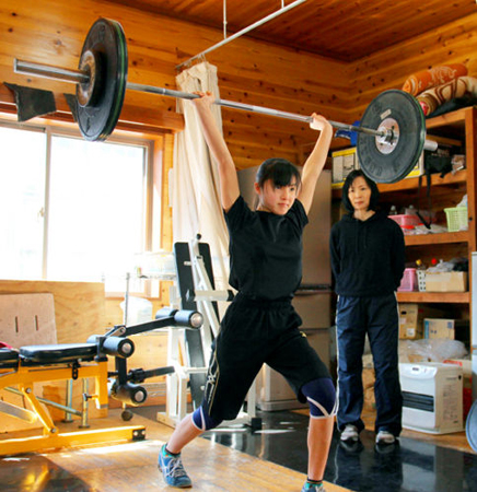 ウエイトリフティングの全国大会を想定した練習に励む川﨑菜々紗さん。コーチで母のさと美さん(右)が見守る=宮津市上司・海洋高