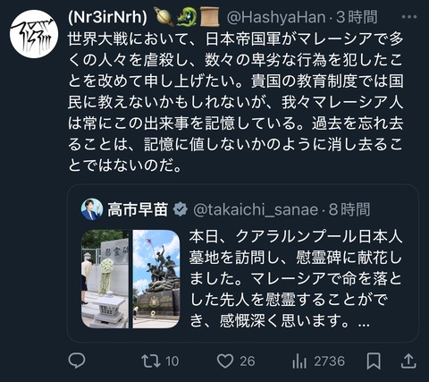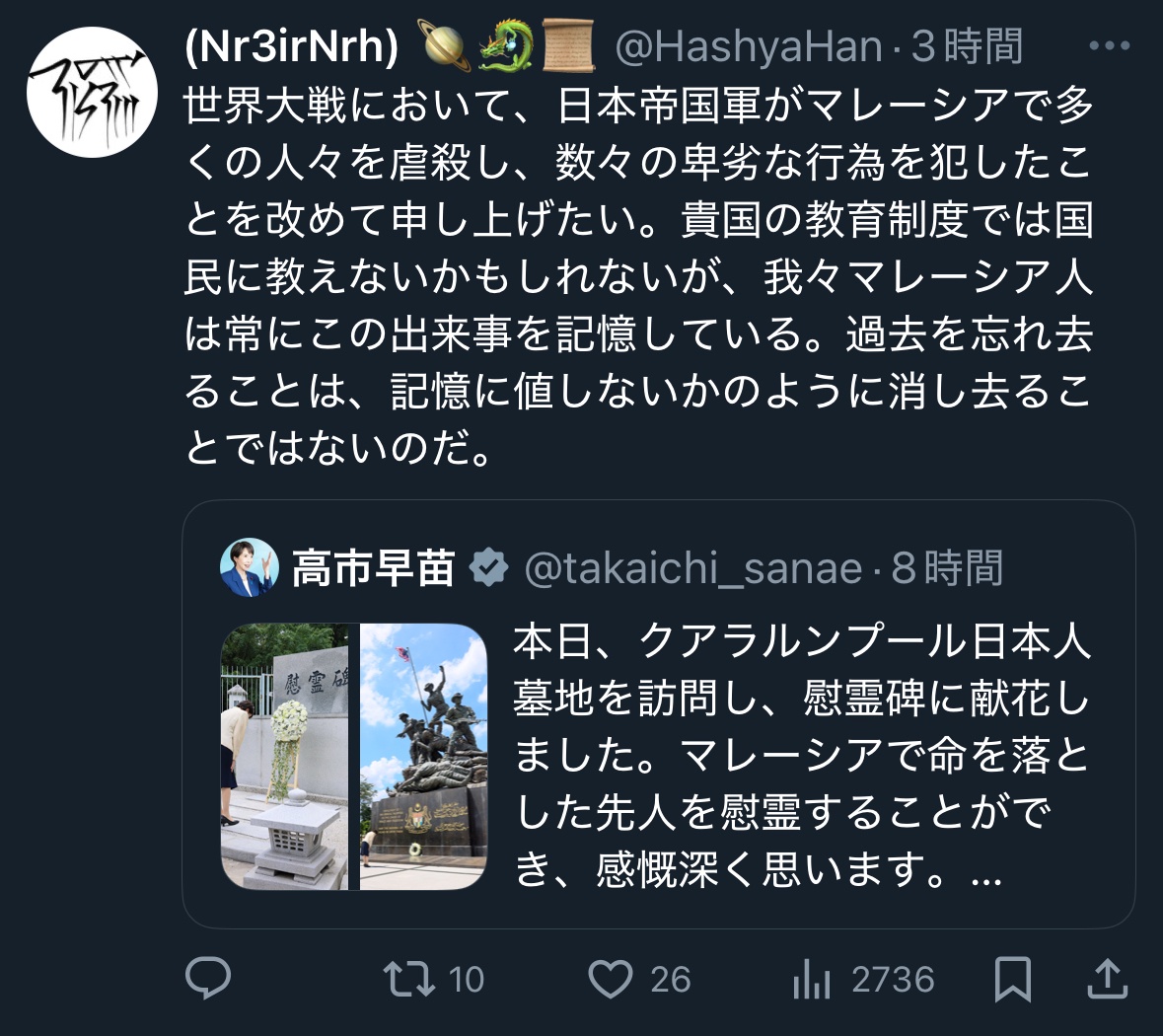 【大炎上】高市、マレーシアの日本兵墓地に参拝→マレーシア大炎上「人殺し侵略者の墓地に参拝、許せない」 X Facebook はてブ LINE コピー 2025.10.27 スポンサーリンク 1:黒トラ(ジパング) [US]:2025/10/27(月) 15:58:15.30 ID:mJLHPC490 BE:732289945-2BP(2000) 続きを読む