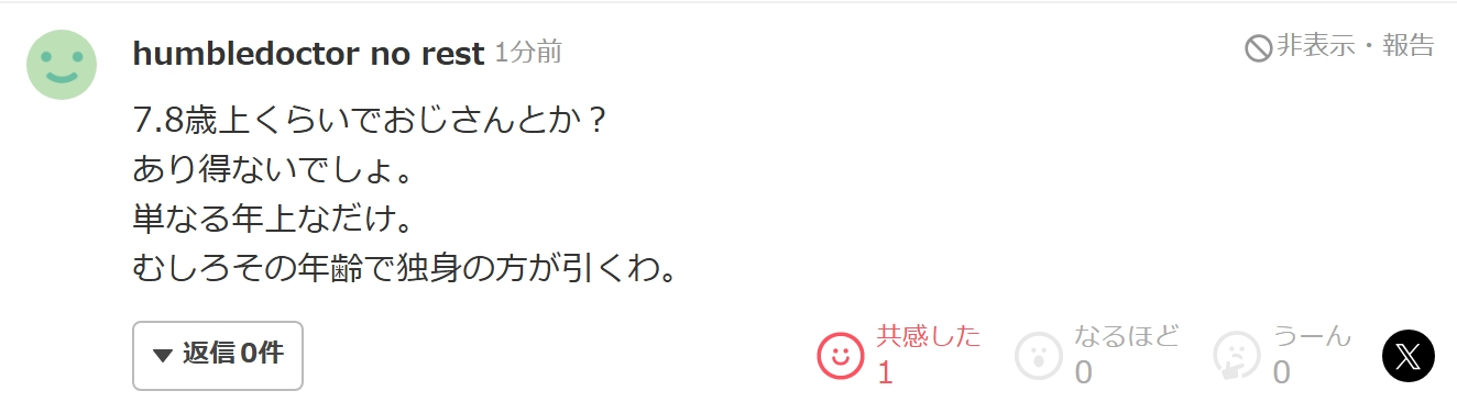 ヤフコメ民「7~8歳くらい年上なだけでオジサン扱いとかありえないでしょ。単なる年上なだけ」